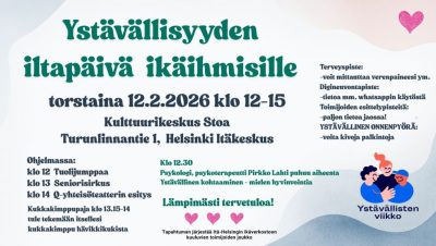 Ystävällisten viikolla torstaina 12.2. on tiedossa kaksi ikäihmisille suunnattua tapahtumaa, joissa muistutellaan arjen ystävällisistä teoista ja niiden merkityksestä ikäihmisille. Toinen pidetään Espoon Ison Omenan kauppakeskuksen yläkerran Kohtaamiskahvilassa ja toinen Helsingin Itäkeskuksen Kulttuurikeskus Stoassa.